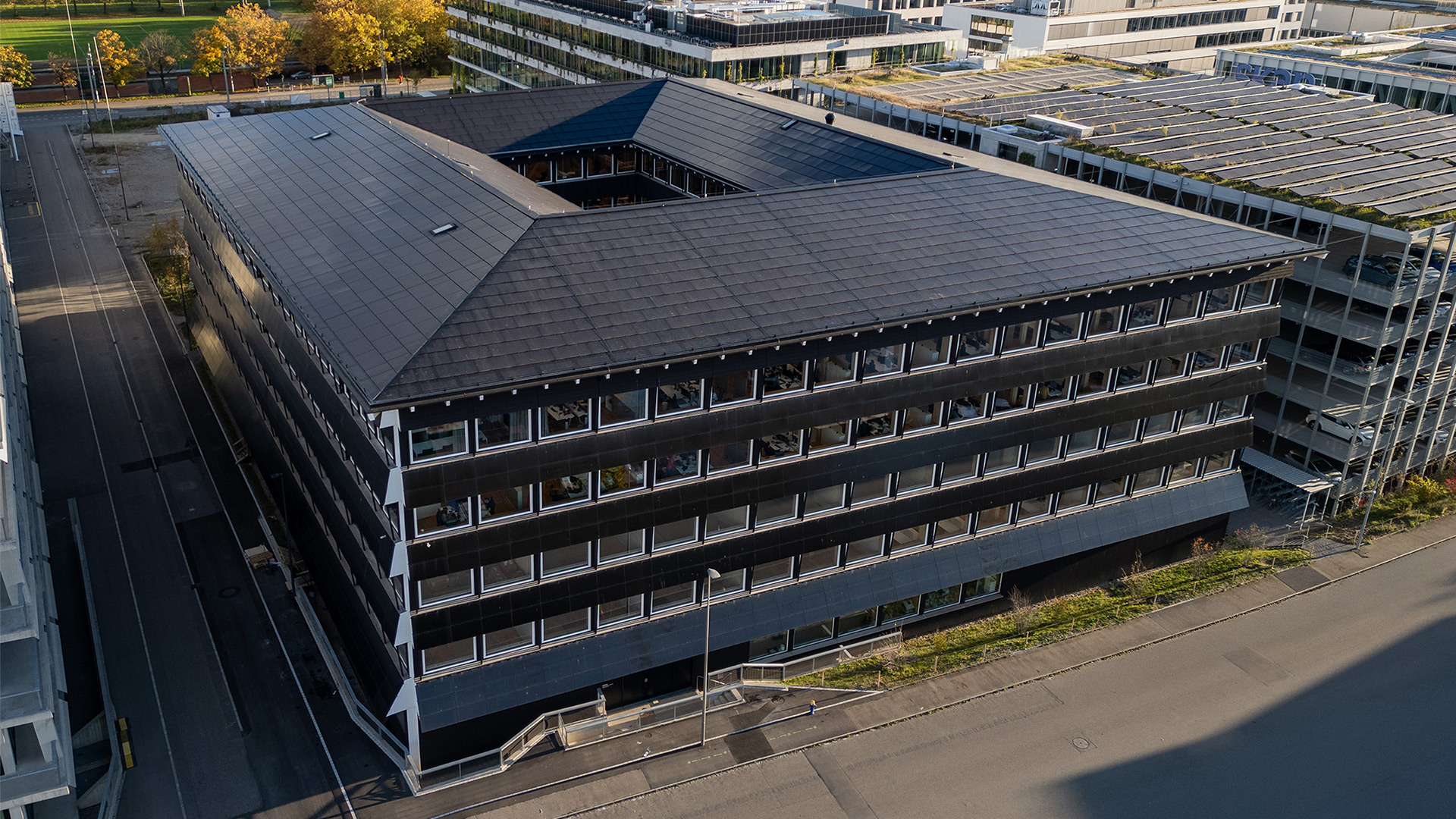 Es wurden auf über 5’000 m2 Solarmodule in das Gebäude integriert. Mit einer Jahresproduktion von 800’000 kWh amortisieren die Module ihre graue Energie in weniger als einem Jahr und machen das gesamte Bauwerk bereits in nur einer Generation energiepositiv.