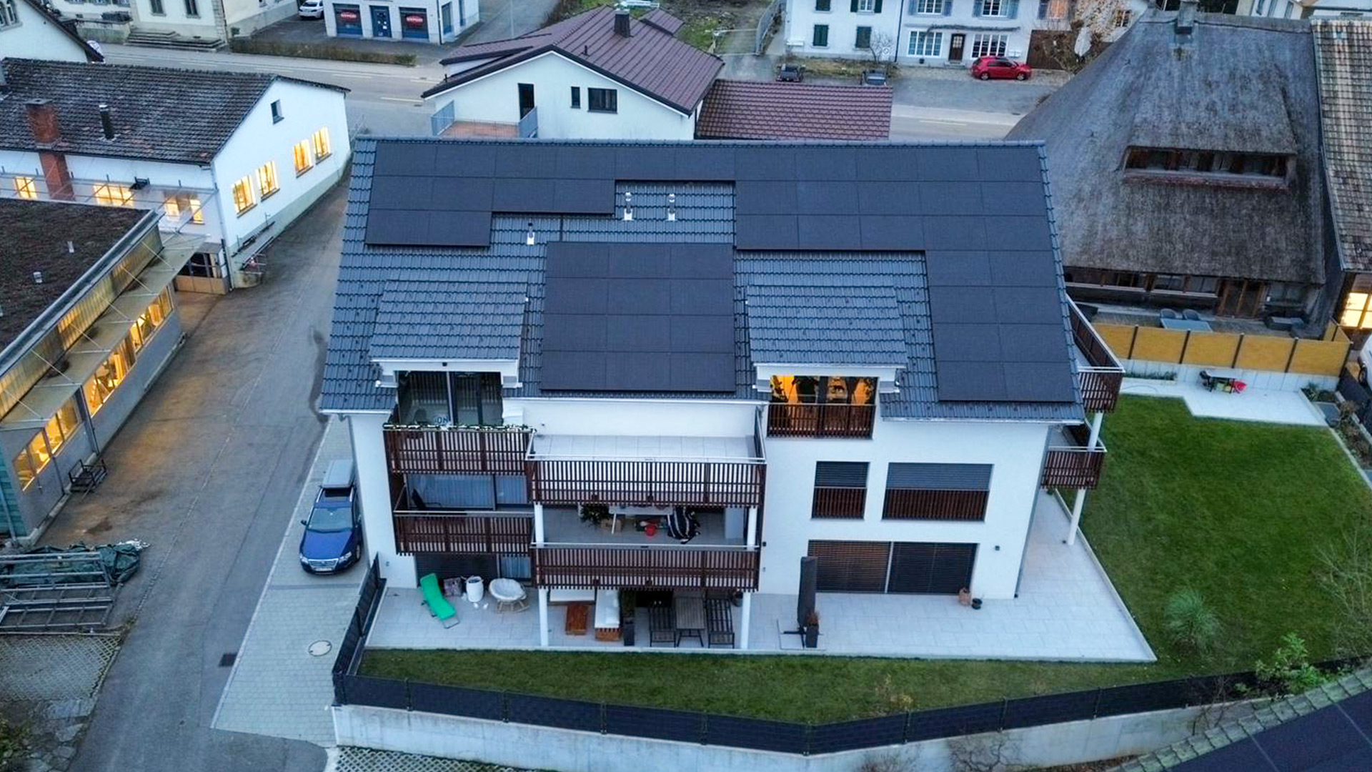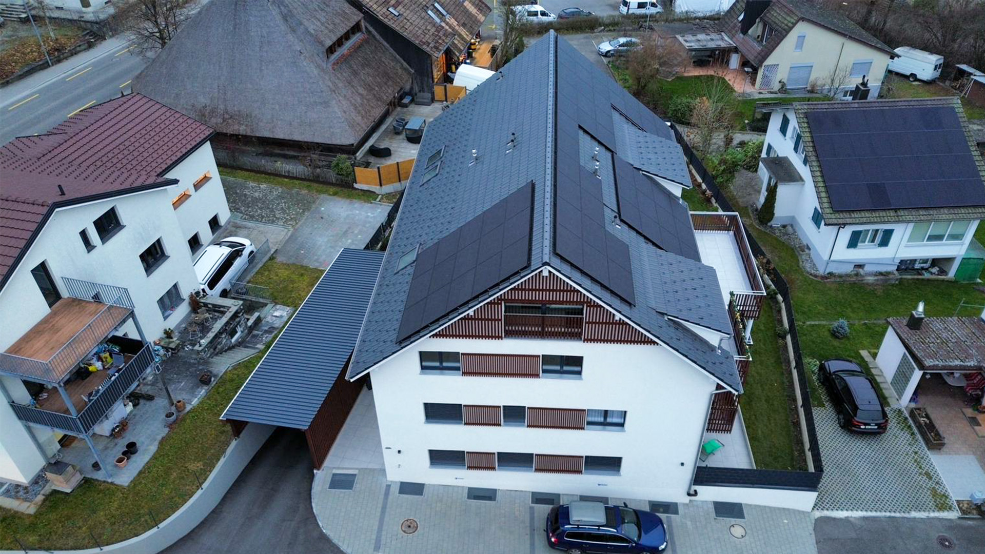 Moderne PV-Anlage auf einem Einfamilienhaus, realisiert mit unseren leistungsstarken M450 Hochleistungsmodulen. Maximale Effizienz für eine unabhängige und nachhaltige Energieversorgung.