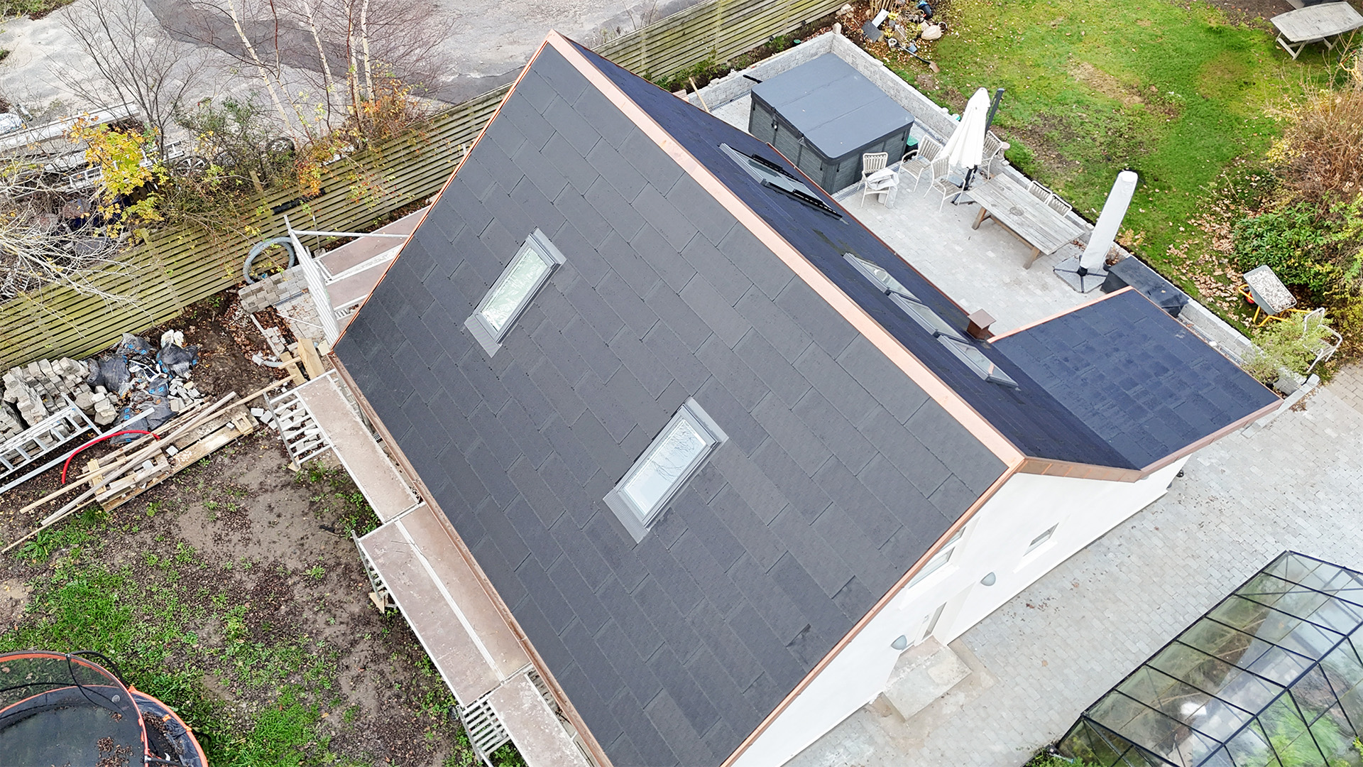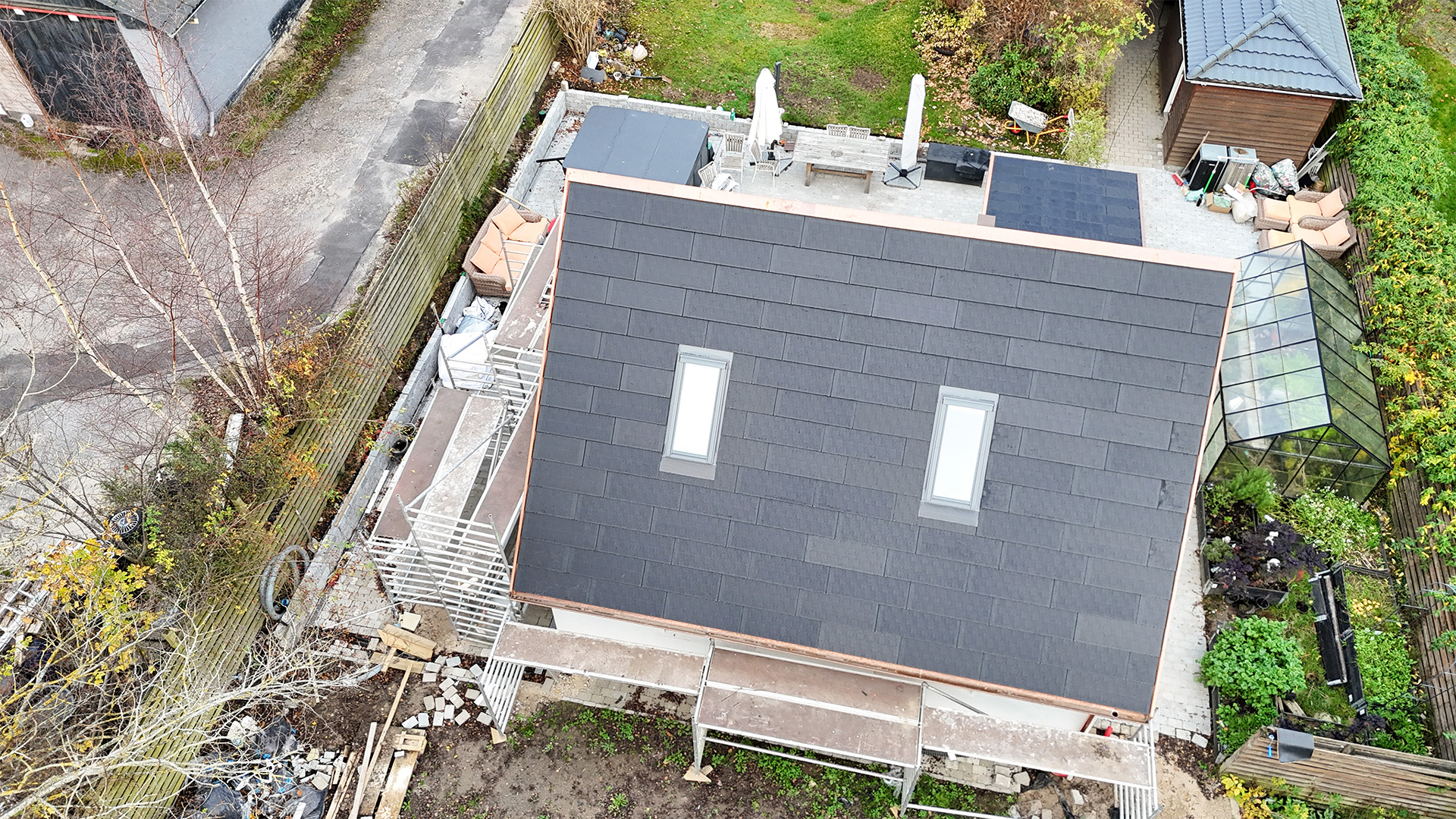 Mit unserem MATCH Slate Indachsystem, ausgestattet mit den hochwertigen MATCH Slate Modulen, erhält dieses Haus eine stilvolle und zugleich funktionale Dachlösung. Was auf den ersten Blick wie eine klassische, harmonische Dachfläche erscheint, ist in Wahrheit eine elegant integrierte Photovoltaikanlage.