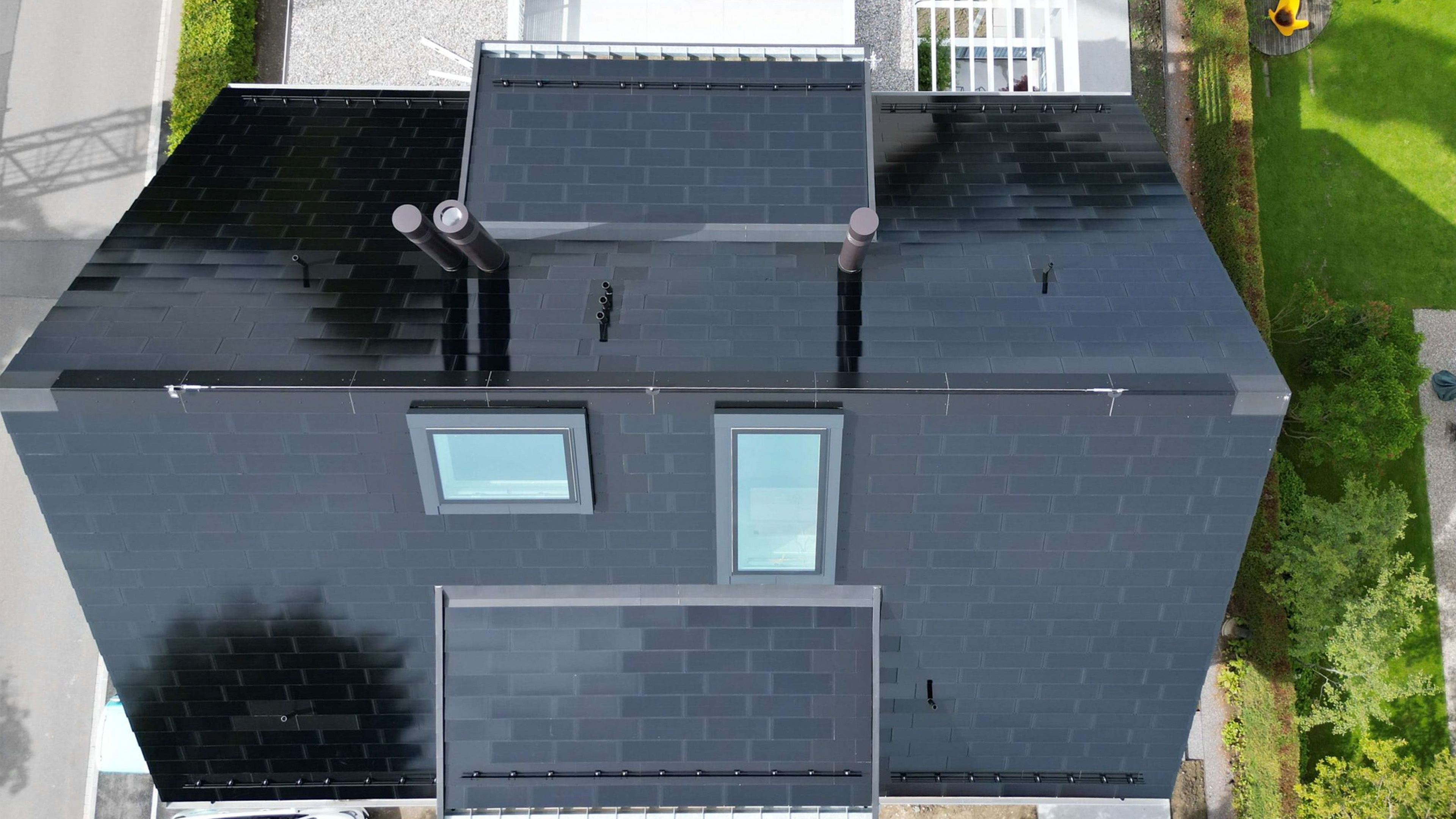 Mit unserem MATCH Slate Indachsystem, kombiniert mit den leistungsstarken MATCH Slate Modulen, wird dieses Gebäude um eine ästhetische und zugleich effiziente Dachlösung bereichert.