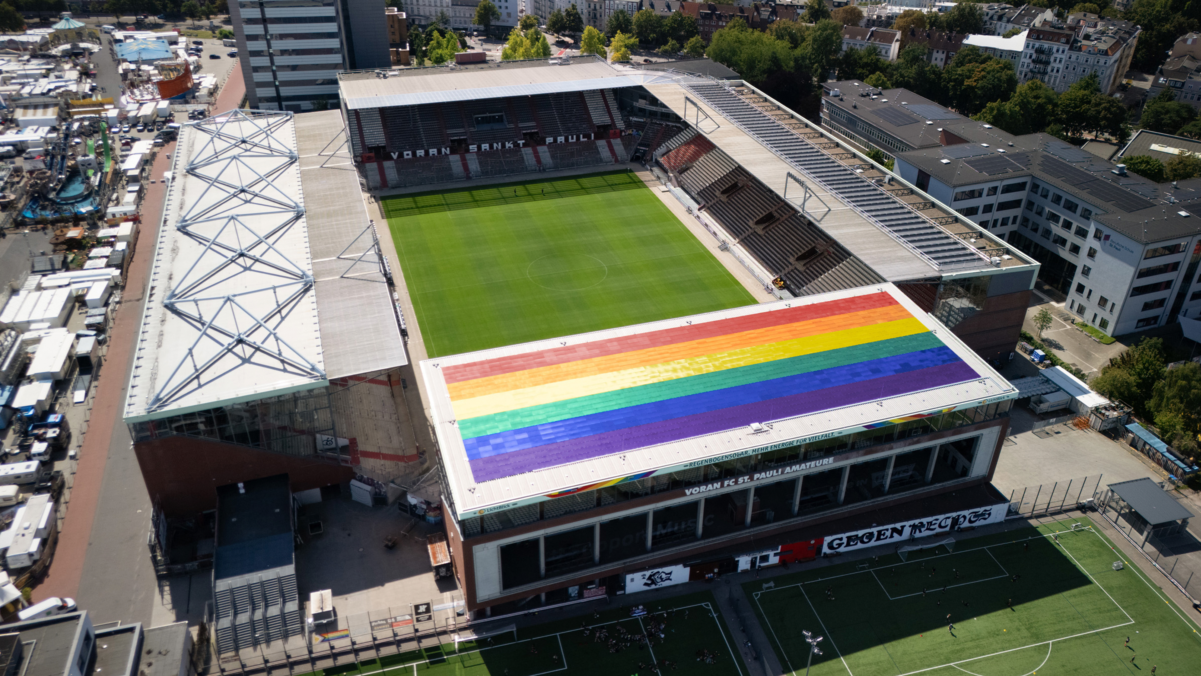 Mit der weltweit ersten Photovoltaikanlage in Regenbogenfarben auf dem Dach der Nordtribüne des Millerntor-Stadions setzen wir gemeinsam mit LichtBlick und dem FC St. Pauli ein starkes Zeichen für Innovation, Vielfalt und Nachhaltigkeit.